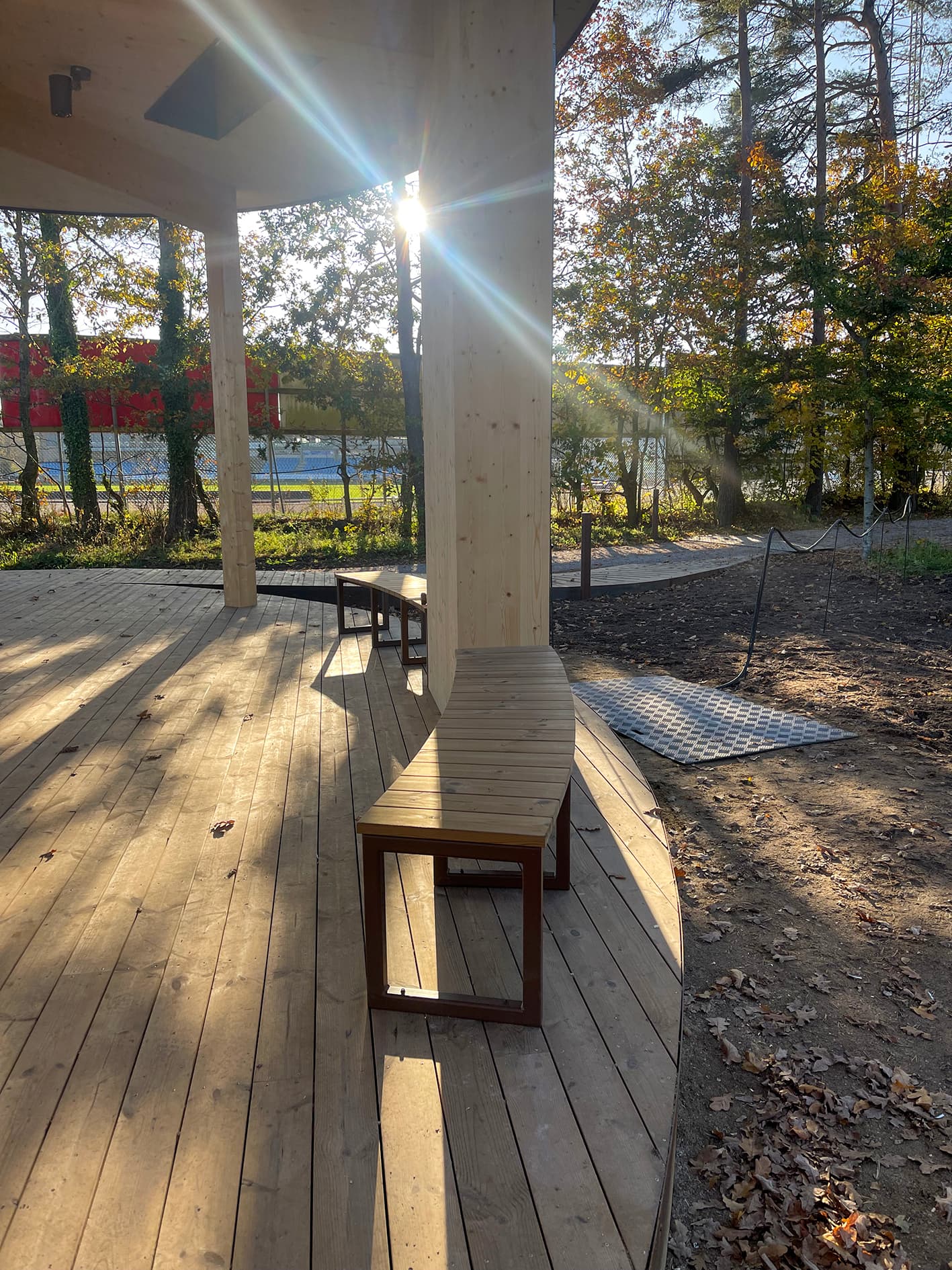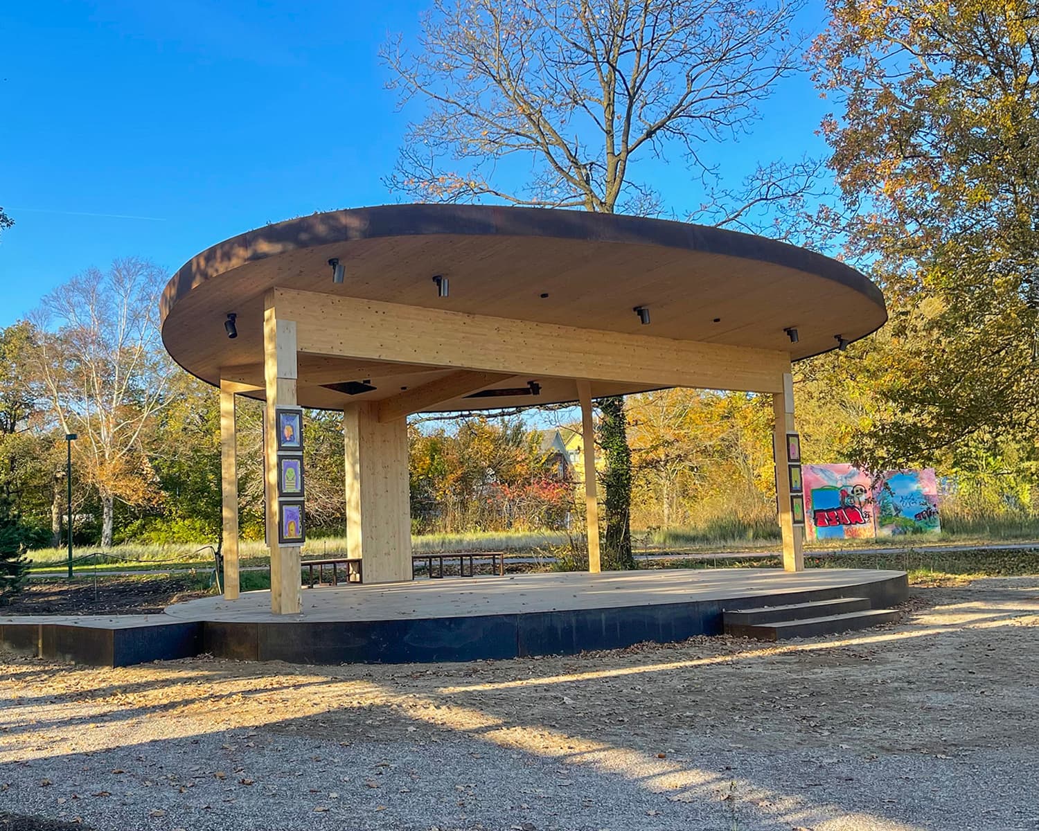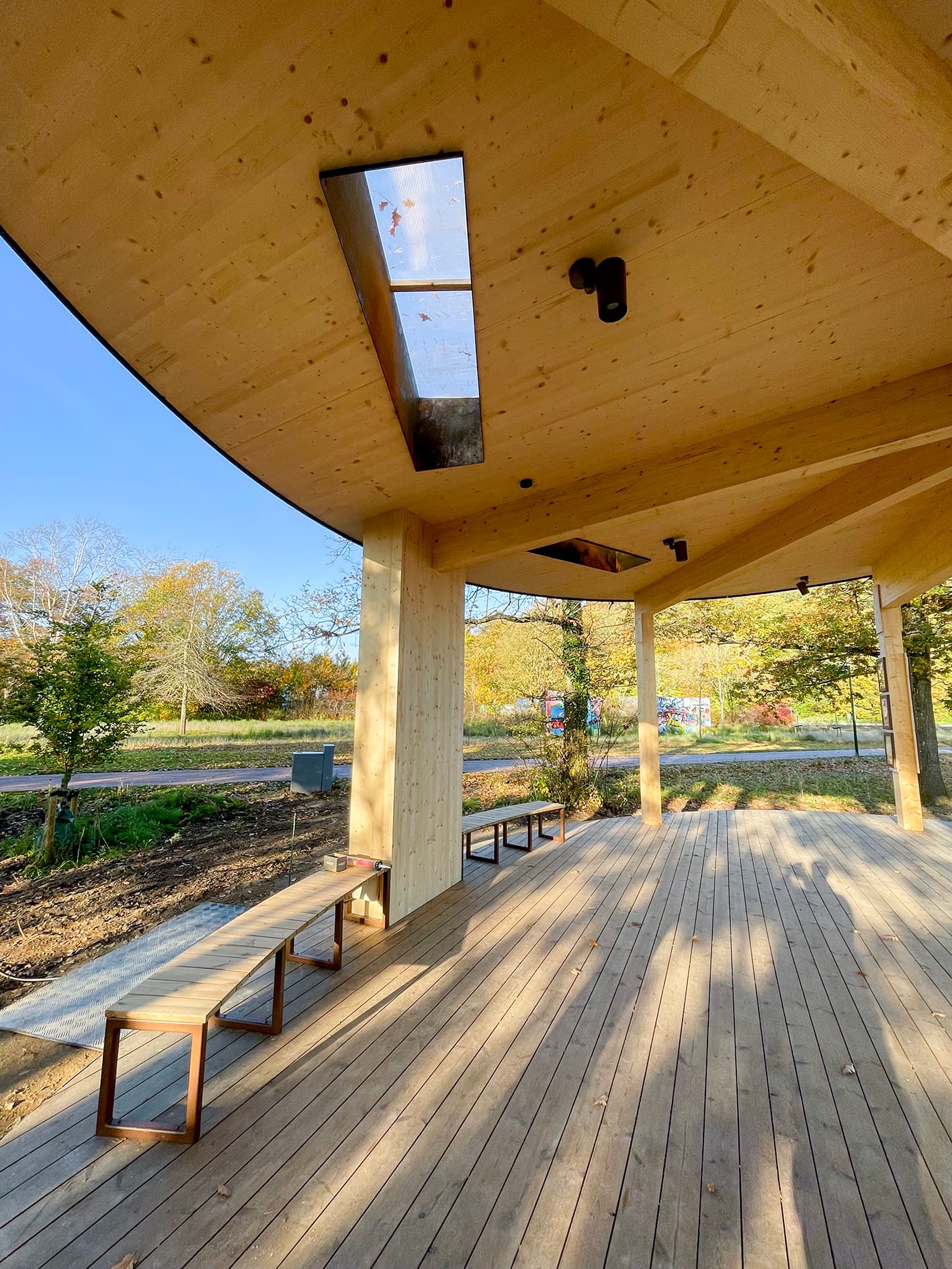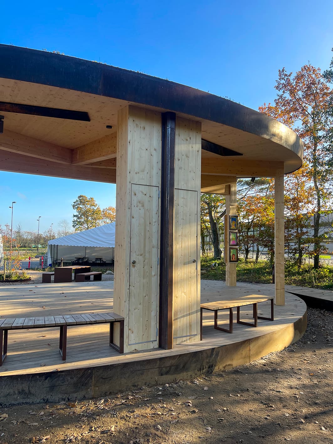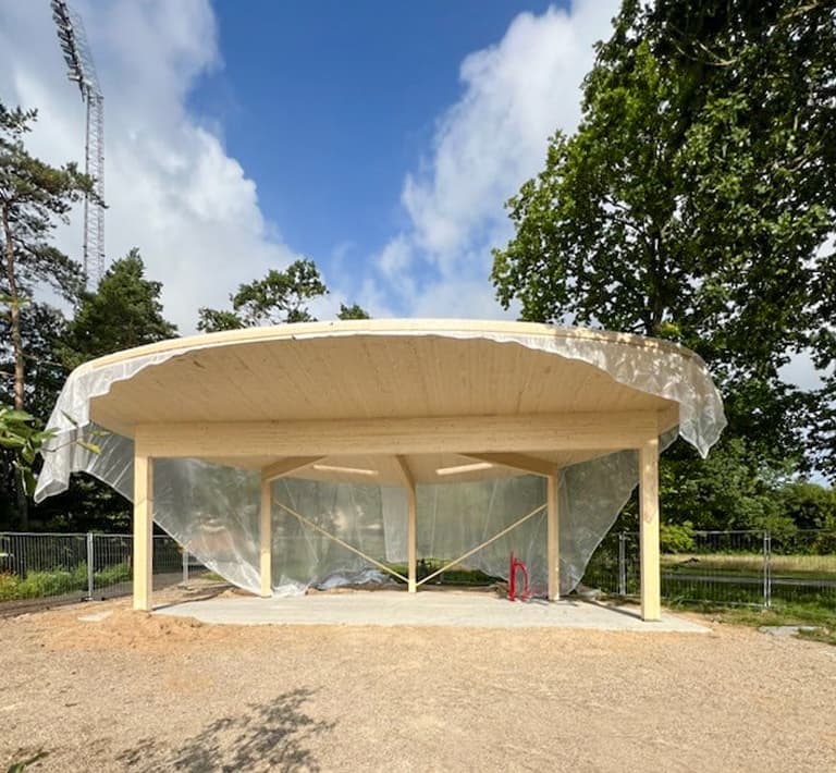 I projektet har vi lagt vægt på holdbare og æstetiske materialer, der integrerer pavillonen harmonisk i det rekreative område.