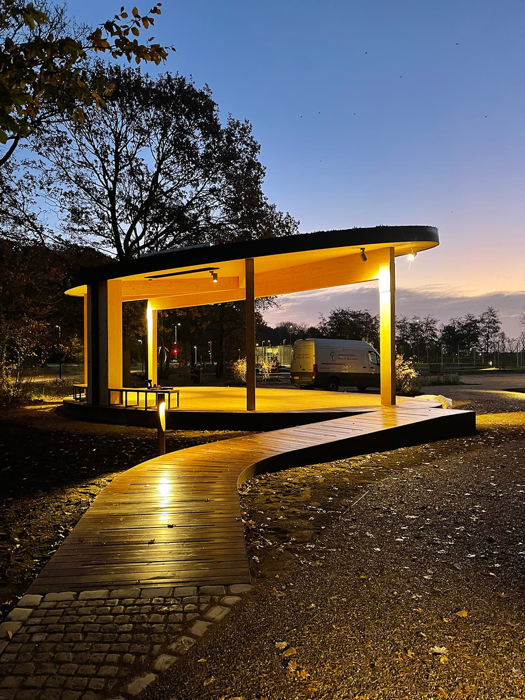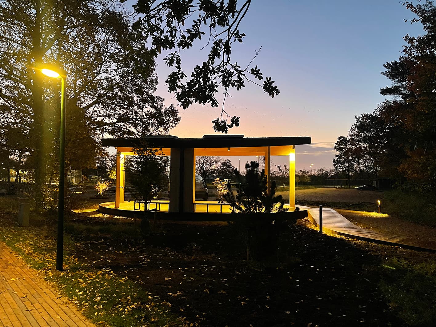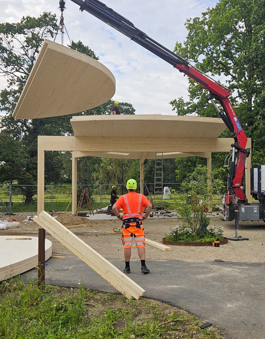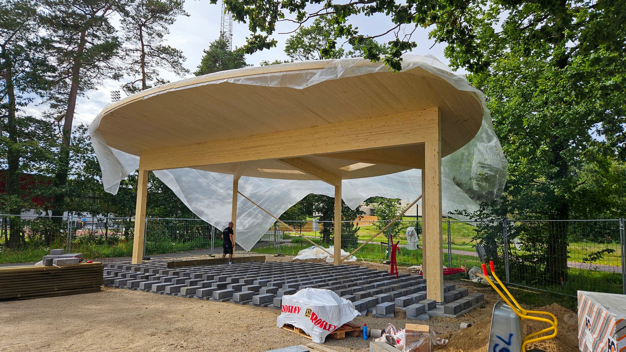 I projektet har vi lagt vægt på holdbare og æstetiske materialer, der integrerer pavillonen harmonisk i det rekreative område.