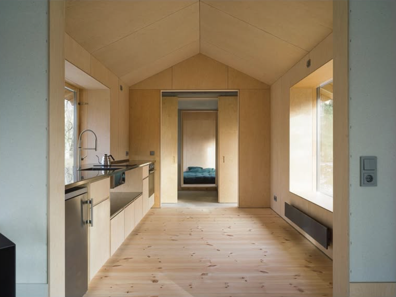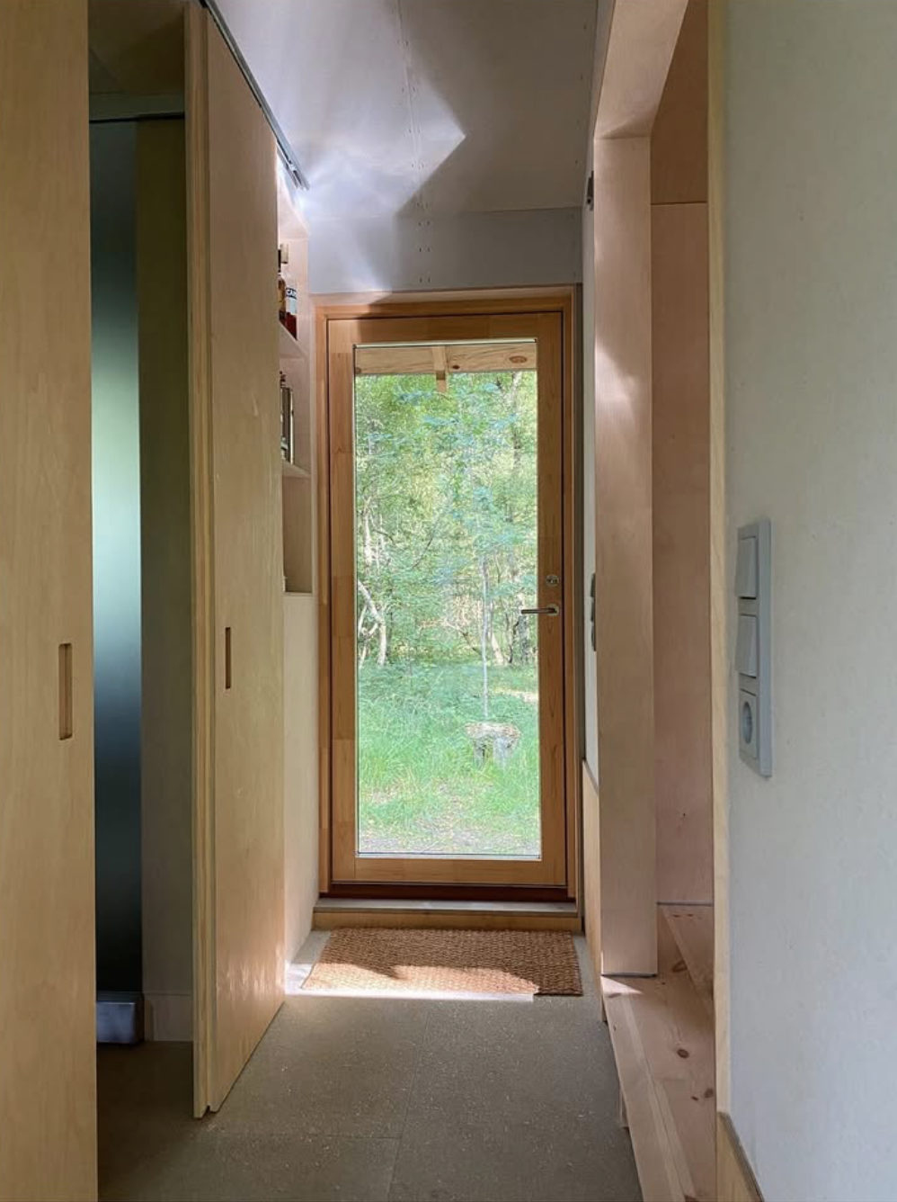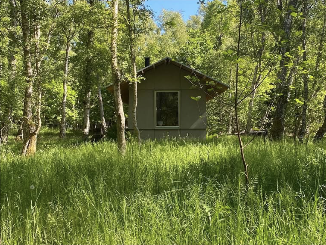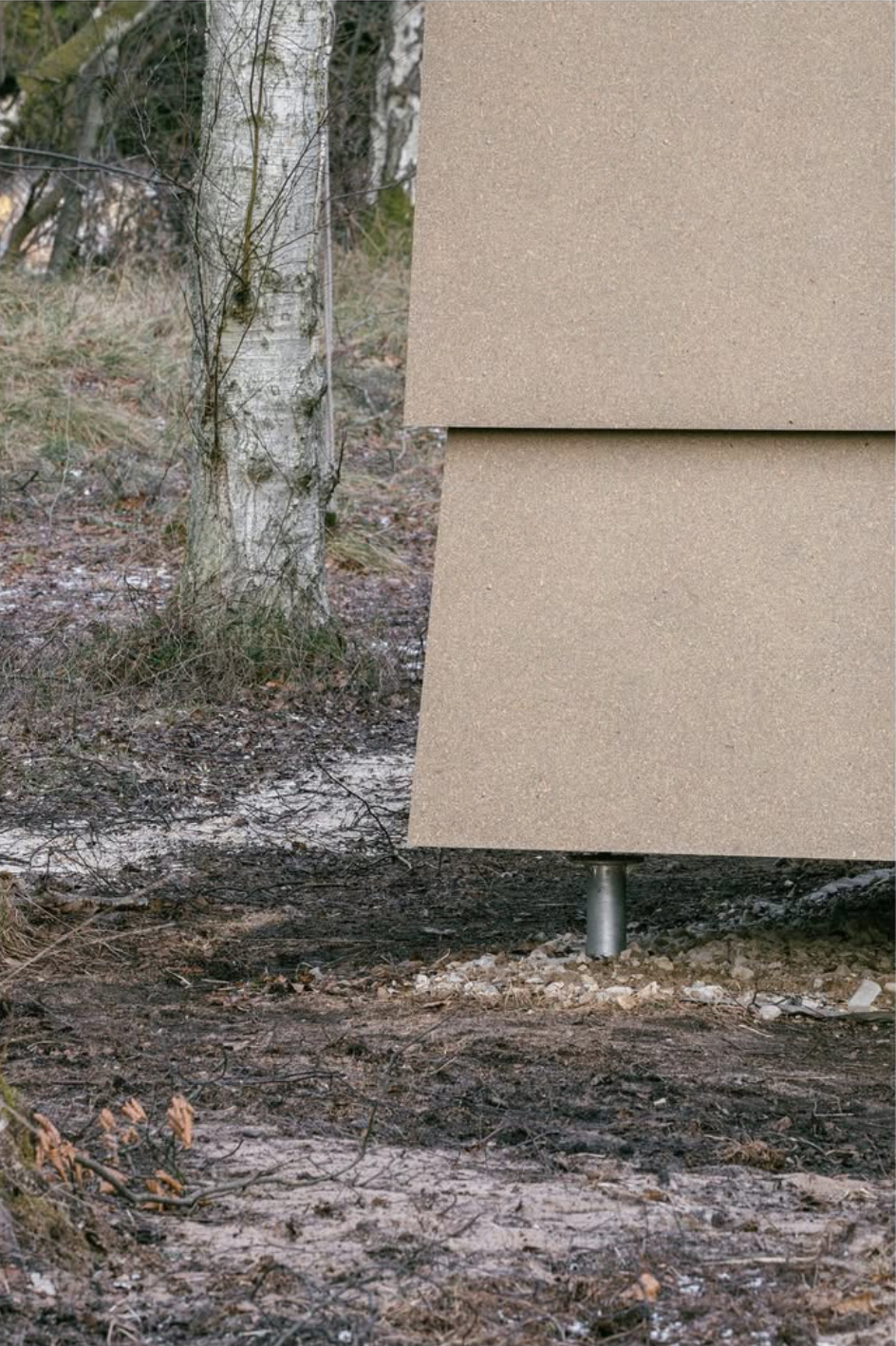 I skovens rolige omgivelser står dette sommerhus som et eksempel på, hvordan arkitektur kan eksistere i harmoni med naturen. Byggeriet er udført uden betonfundament og hviler i stedet på spiralformede søjler, hvilket bevarer skovbunden og minimerer miljøpåvirkningen. Husets lette trækonstruktion og beskedne materialevalg skaber en næsten svævende fornemmelse, der understreger projektets bæredygtige tilgang.