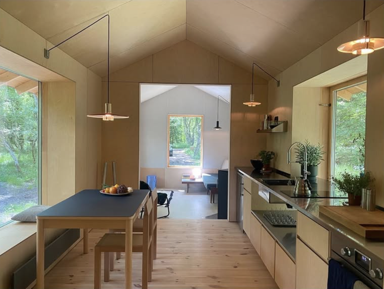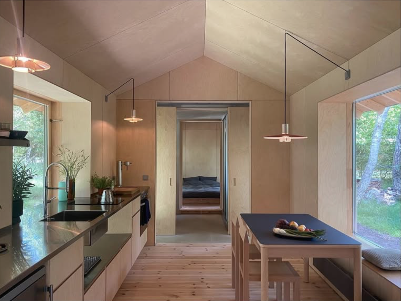 Sommerhuset er designet med en funktionel planløsning, hvor køkkenet danner hjertet af hjemmet. Gæsteværelset har separat adgang udefra, hvilket giver en følelse af privathed og fleksibilitet i brugen af huset.