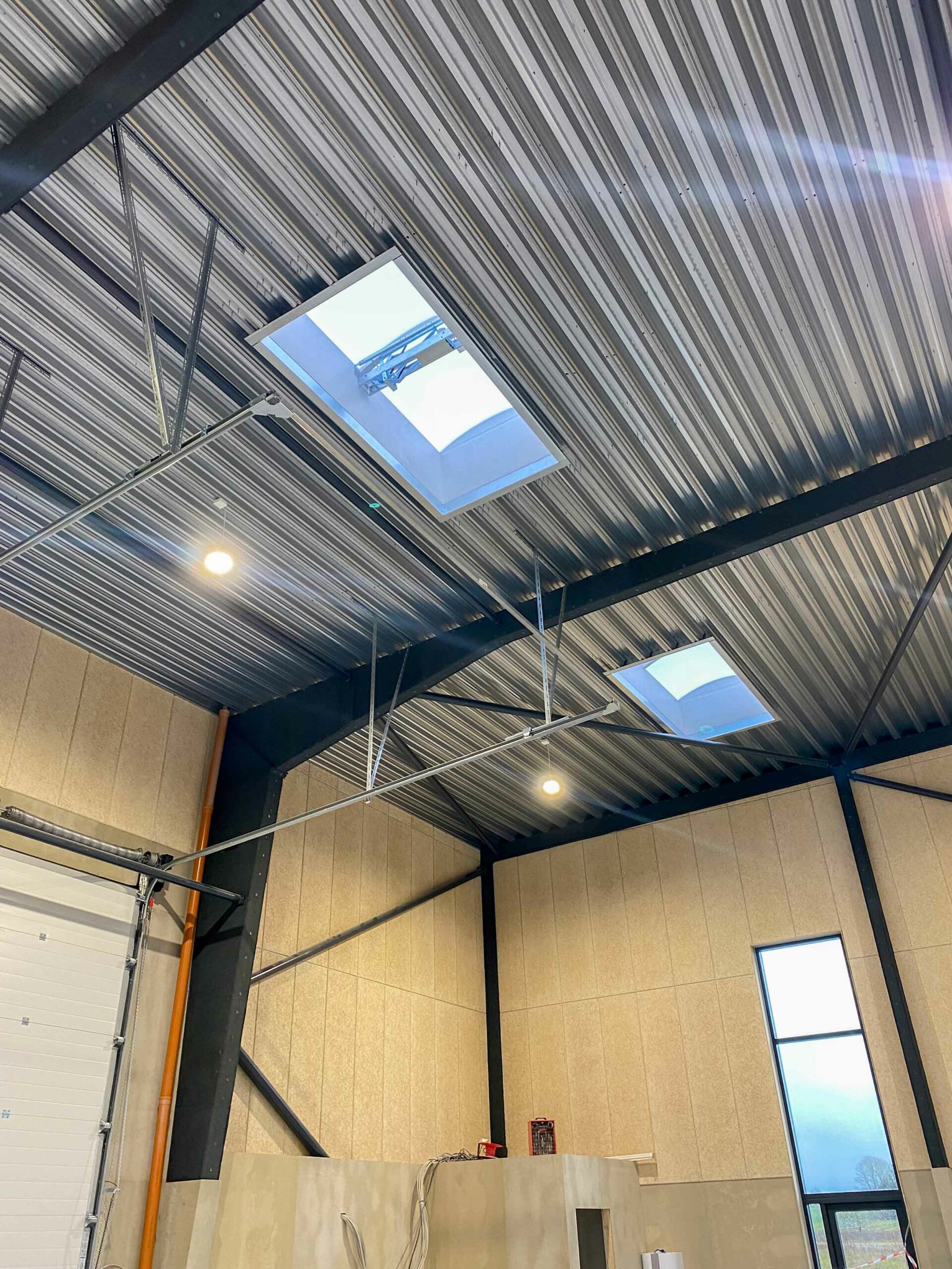 Tagkonstruktionen er opbygget med stålplader, isolering og tagfolie og suppleres af ovenlys, der bidrager med dagslys til bygningen. Store industriporte giver nem adgang for service og installation af teknisk udstyr. Indvendigt er bygningen indrettet med fokus på overskuelighed og funktion, herunder et mindre serviceområde med toilet og tekniske rum.