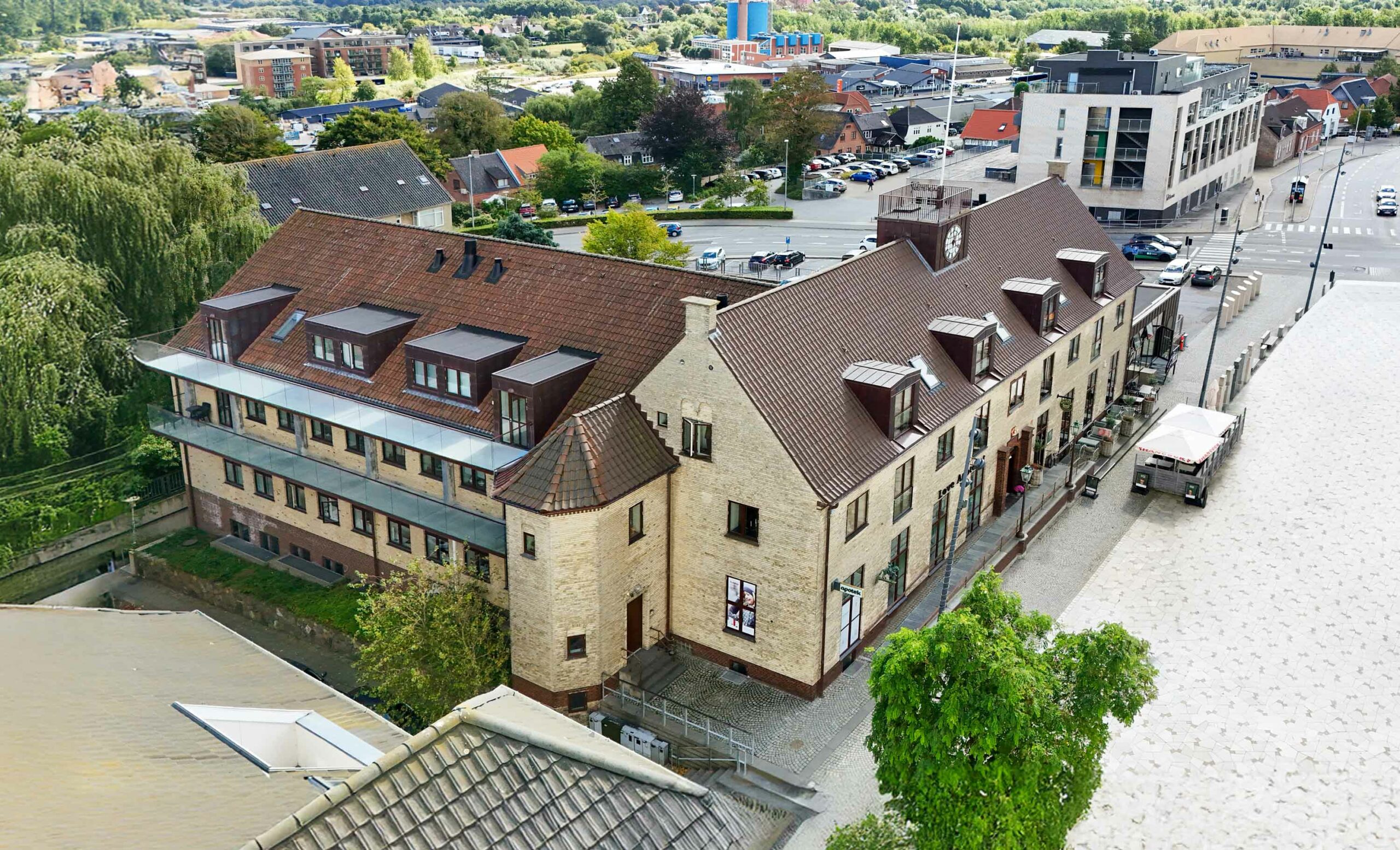 Apoteket er indrettet i nye, tidssvarende lokaler med tilhørende kontorer, kantine, laboratorium og pakkerum. Derudover rummer stueetagen endnu et erhvervslejemål, som er velegnet til eksempelvis klinik eller lignende funktion. Gårdrummet er samtidig aktiveret som adgangsvej til boligerne og bidrager til en klar og funktionel opdeling mellem offentlige og mere private zoner.