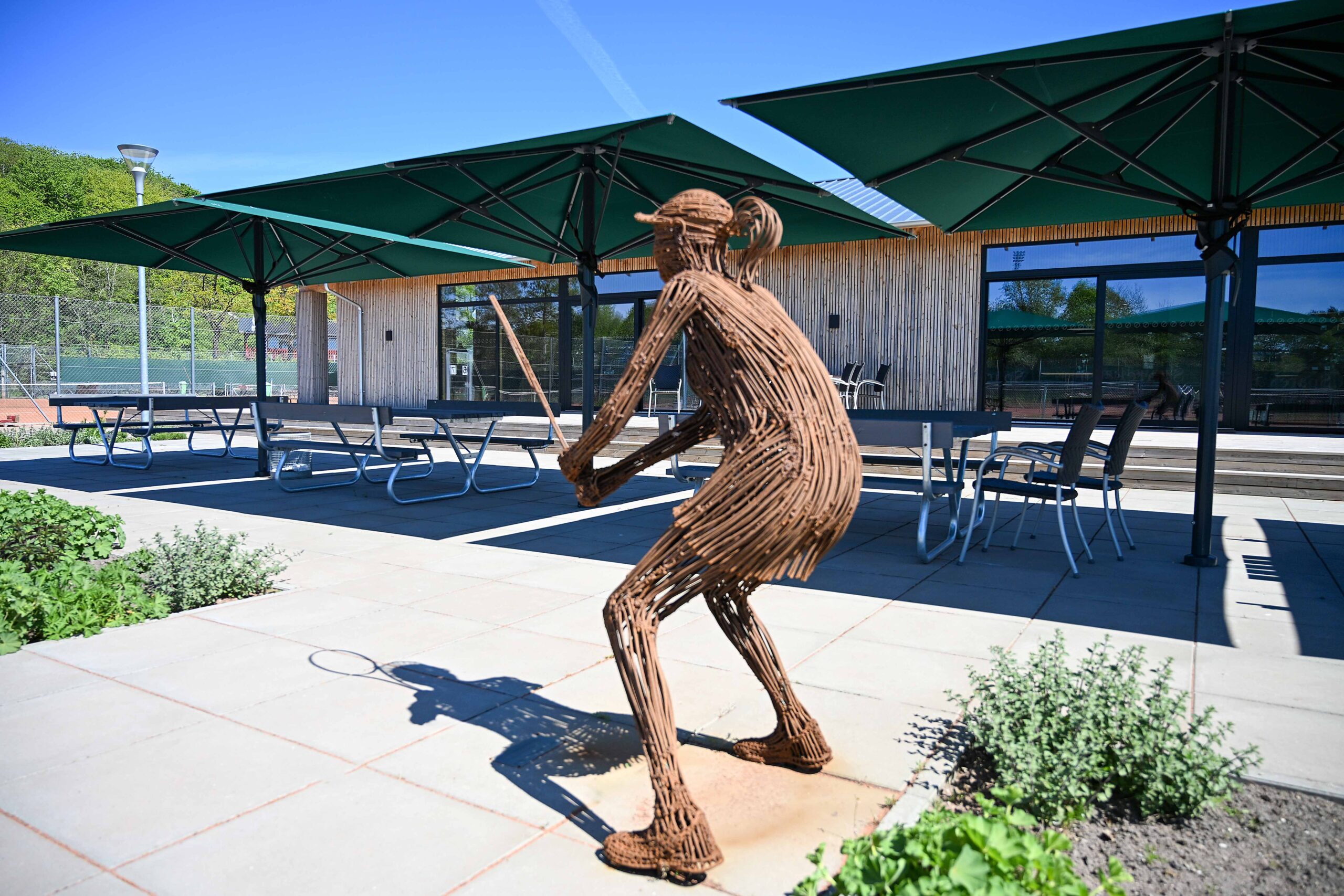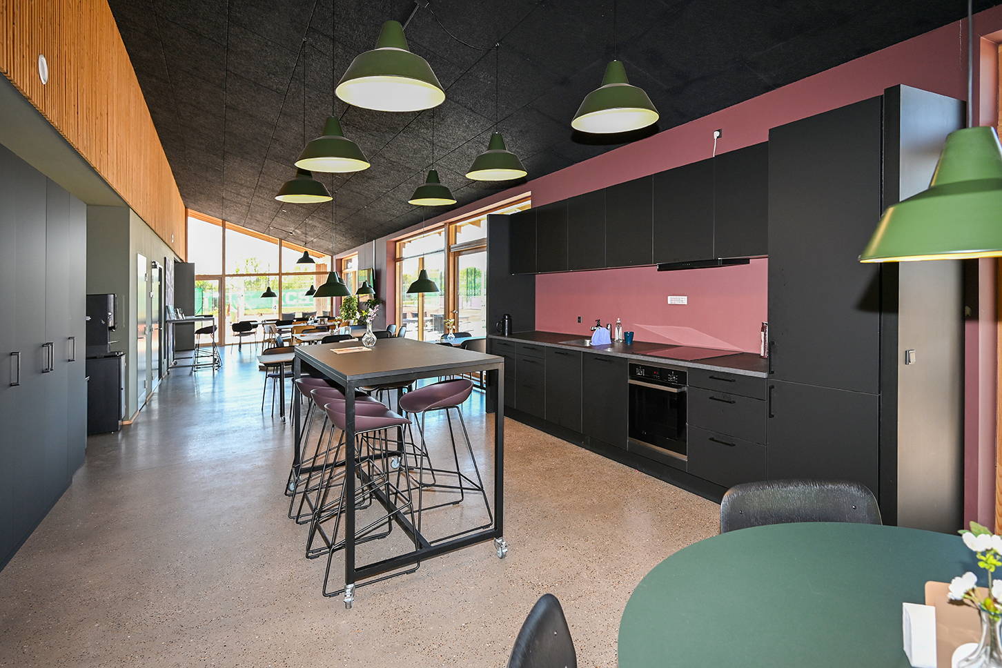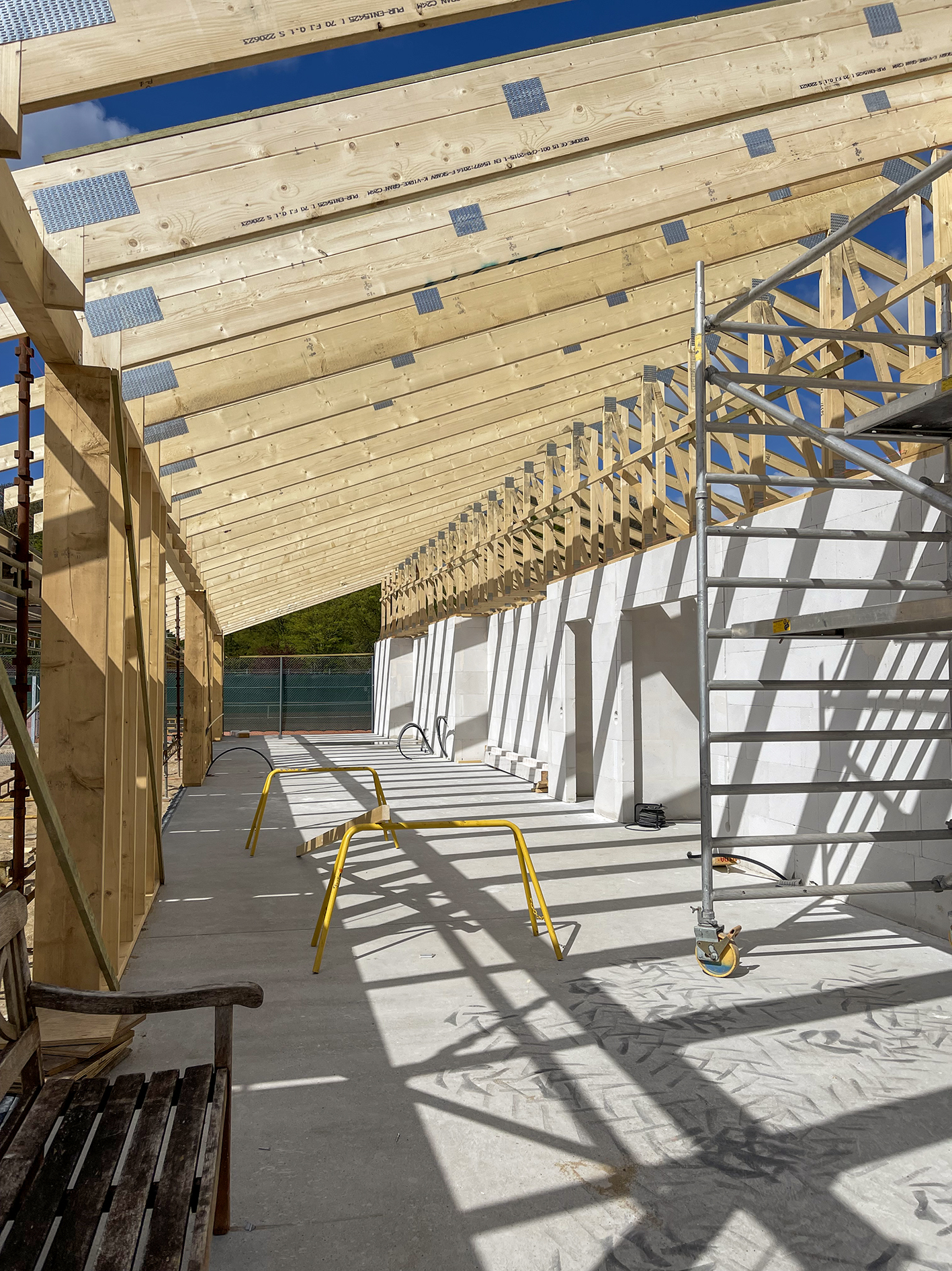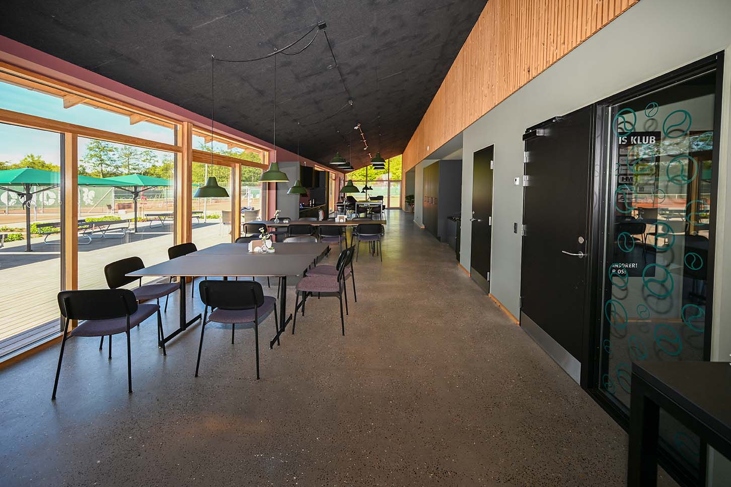 Indvendigt er lofterne beklædt med Troldtekt-plader, som sikrer god akustik, mens væggene er afsluttet med fibergips og enkelte steder beklædt med trælister for at tilføre varme og struktur til rummene. Gulvene er udført i slebet og poleret beton, hvilket giver en slidstærk overflade, der er nem at vedligeholde – særligt med tanke på det røde grus fra tennisbanerne.