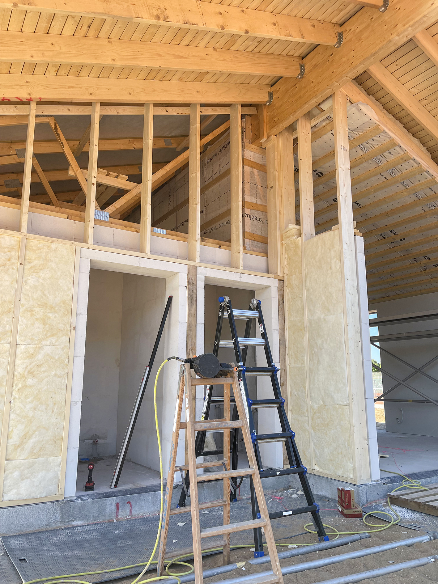 Byggeriet er opført med en solid trækonstruktion, hvor ydervæggene består af 245 mm konstruktionstræ med krydsforskalling og isolering. Facaden kombinerer mørk, vandret træbeklædning med lyse, lodrette træelementer, hvilket giver huset et indbydende og moderne udtryk. Taget er beklædt med grå pandeplader og har et stort udhæng, der beskytter facaden mod vejr og vind samt skaber overdækkede opholdsarealer.